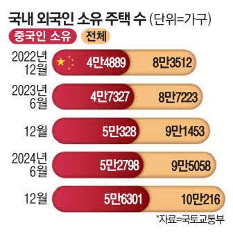 외국인이 소유한 국내 주택 수가 처음으로 10만가구를 넘어섰다. 절반 이상은 중국인이 소유한 것으로 나타났다. 외국인 소유 부동산이 빠르게 늘면서 내국인에 대한 규제 역차별과 부동산 시장 교란에 대한 논란도 커지고 있다. 30일 국토교통부는 2024년 말 기준 외국인이 국내 주택 총 10만216가구를 보유하고 있다고 밝혔다. 10만가구를 넘은 것은 이번이 처음이다. 외국인 주택 보유 현황 조사는 2022년 말부터 1년에 두 번씩 이뤄지고 있다.