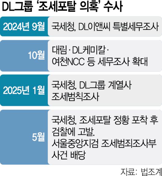 앞서 국세청은 지난해 9월부터 올해 5월까지 약 8개월간 DL이앤씨(옛 대림산업), 그룹 지주사 DL의 대주주인 대림, 핵심 계열사인 DL케미칼과 DL케미칼·한화솔루션 합작사인 여천NCC 등을 대상으로 특별 세무조사를 실시했다. 국세청은 자금 흐름을 살피면서 DL이앤씨가 하청 업체와의 계약 과정에서 수십억 원 규모의 공사비를 추가 지급한 정황이 수상하다고 판단해 검찰에 고발했다.
