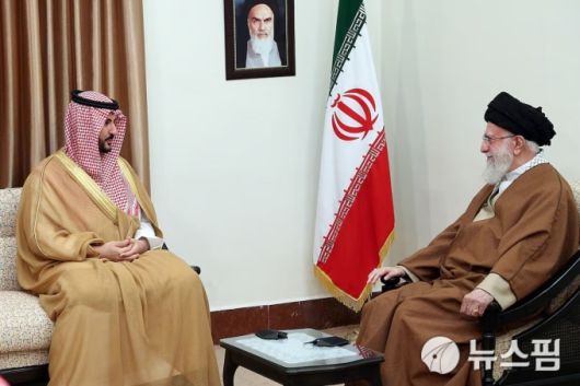 칼리드 빈살만(왼쪽) 사우디아라비아 국방장관이 지난달 17일(현지시간) 이란 테헤란 대통령 관저에서 아야톨라 알리 하메네이 이란 최고지도자를 만나고 있다. [사진=로이터 뉴스핌] |