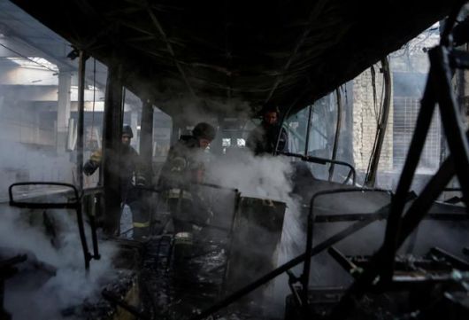 우크라이나 구조대원들이 30일 우크라이나 북동부 하르키우에서 러시아의 무인기(드론) 공격을 받은 트롤리(전기)버스 창고에서 구조 작업을 벌이고 있다. 하르키우=로이터 연합뉴스 |