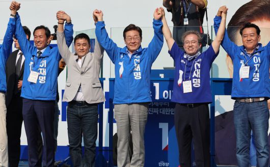이재명 더불어민주당 대통령 후보가 열세 지역으로 분류되는 강원과 충북 지역의 표심 공략에 나선 30일 강원도 원주시 반곡동 원주행복마당에서 열린 유세에서 시민들에게 인사하고 있다. 연합뉴스 |