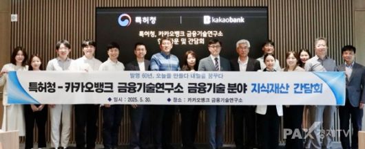 특허청 박재훈 전기통신심사국장(왼쪽 아홉 번째)이 간담회를 마치고, 참석자들과 기념촬영을 하고 있다. [사진제공=특허청][대전=팍스경제TV] 특허청은 오늘(30일) 오후 2시, 금융 AI 기술 분야에서 혁신을 주도하고 있는 카카오뱅크 금융기술연구소(경기도 성남시)를 방문해 지식재산 관련 현장소통 간담회를 진행했다고 밝혔습니다.
