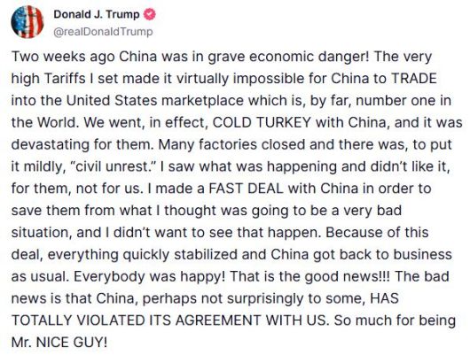트럼프 대통령은 30일(현지 시간) 자신의 소셜미디어 트루스소셜에 "2주 전만 해도 중국 경제는 미국의 고율 관세로 심각한 위기에 처해 있었다"며 "우리가 아닌 그들을 위해 매우 빠른 무역 협상을 성사시켰지만 중국은 우리와의 약속을 완전히 어겼다"고 말했다.