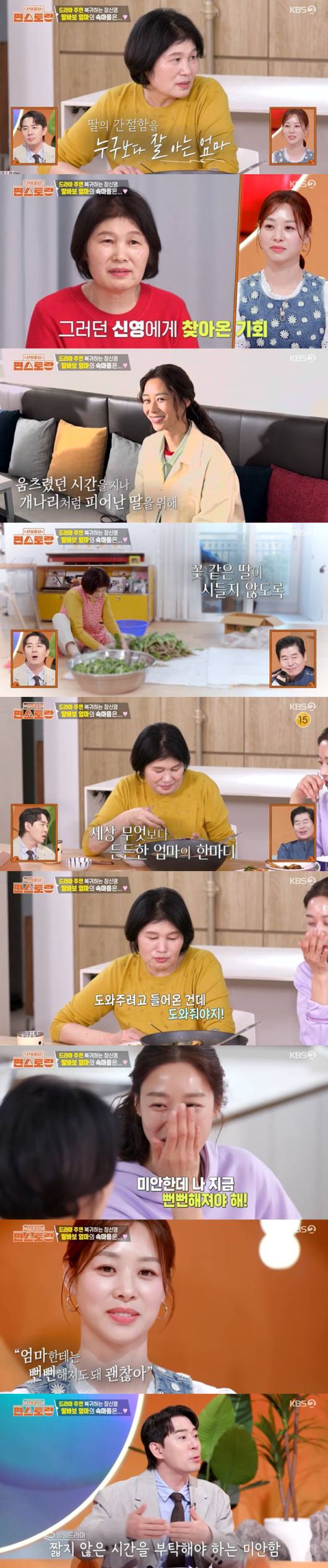 어머니는 "얘가 힘든 시가가 있었지 않냐"라며 장신영의 남편 강경준의 불륜 논란을 간접 언급, "그것 때문에 일을 나가서 해야 하는 앤데, 집에서 갇혀살다시피 했지 않냐. 활기 있게 해야 하는데 그걸 못하니까 마음이 아팠다"고 말했다.