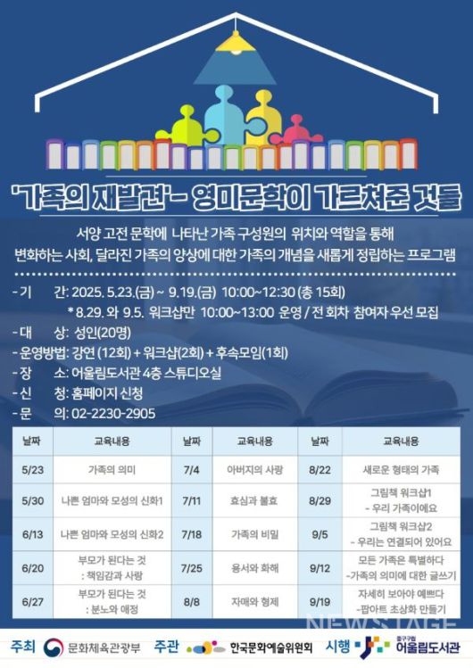 어울림도서관은 가족의 의미와 역할을 새롭게 조명하는 인문학 프로그램 '가족의 재발견-영미문학이 가르쳐준 것들'을 운영한다. 총 15회에 걸친 그림책 워크숍을 통해 서양 고전 문학에 대한 이해를 높이고 가족 구성원의 역할에 대해 생각하며 소통하는 시간을 가진다. 가족의 이해를 넘어 공동체로의 확장을 시도해보는 이 프로그램은 5월 23일부터 9월 19일까지 매주 금요일에 열린다.