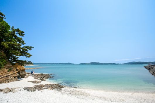 바다 색감과 대비를 이루며 '민어도' 해변을 이국적으로 보이게 하는 하얀 굴 껍데기가 지천으로 깔려있다. / 김용재 영상미디어 기자 |