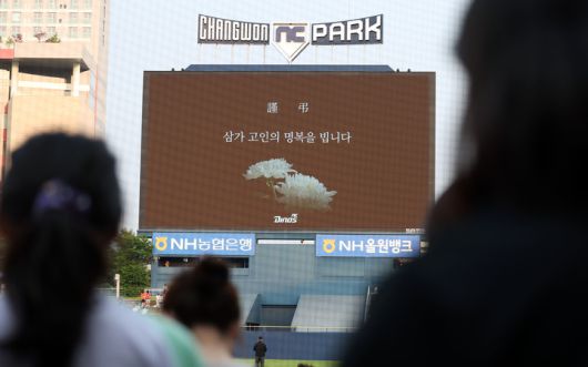 30일 창원NC파크에서 열린 한화와 NC 경기 시작에 앞서 구조물 낙하 사고 사망자에 대해 묵념하며 추모하는 관중들 |