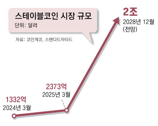 특히 스테이블코인은 일상생활에서 결제, 송금, 정산 등을 좀 더 간편하게 할 수 있는 수단으로 주목받고 있다. 이미 지난 한 해 동안 스테이블코인으로 거래된 금액만 28조 달러(약 3경8000조 원)에 달한다. 이는 마스터카드와 비자카드의 연간 거래액을 합친 것보다 큰 규모다. 올 3월 말 기준 전 세계 스테이블코인 시장은 2373억 달러(약 330조 원) 규모로 추산된다. 최근 영국 스탠다드차타드그룹은 2028년 말까지 해당 시장이 2조 달러(약 2790조 원)까지 커질 것으로 전망했다. 미국 씨티그룹은 2030년까지 관련 시장 규모가 1조6000억 달러(약 2200조 원)에 달할 수 있다고 점친 바 있다. 현재 스테이블코인 시장에서는 미 달러에 페깅되는 테더(USDT·시가총액 약 210조 원)와 서클(USDC·84조 원)의 점유율이 95%로 압도적인 편이다.