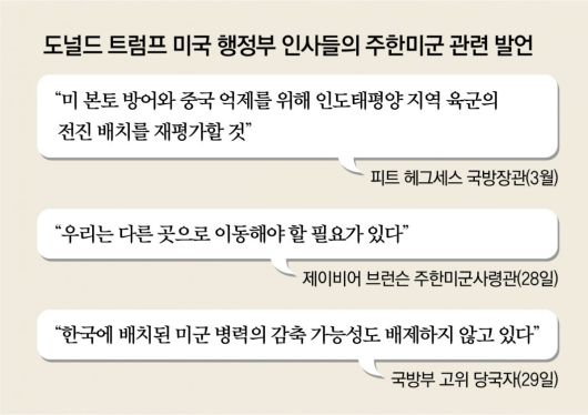 정부는 여전히 주한미군 감축 등이 한미 간 공식적으로 논의된 적 없다는 입장이다. 다만 정부 소식통은 “한국의 정치적 불확실성이 해소되면 한미 간 논의가 본격적으로 진행될 것으로 보인다”고 전했다.