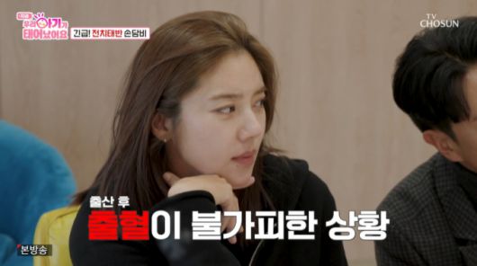 가수 겸 배우 손담비가 전체 전치태반으로 위험한 상황 속 출산해야 하는 불안감을 호소했다./사진=TV조선 '우리 아기가 태어났어요' 방송 화면 |