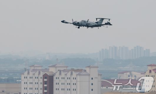 경기 평택시 팽성읍 주한미군기지 캠프 험프리스에 정찰기 RC-12X 가드레일이 이륙하고 있는 모습. 2025.5.23/뉴스1 ⓒ News1 김영운 기자 |