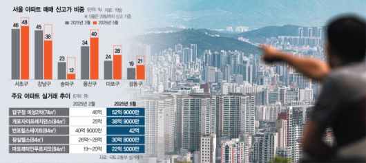30일 프롭테크 기업 직방에 따르면 올해 5월(29일까지 신고 기준) 서초구 아파트 매매 거래 중 신고가 비중은 48%에 달했다. 이는 전월(35%)은 물론 토지거래허가구역 해제로 집값이 크게 뛴 2월(47%)보다도 높은 수치다. 용산구 신고가 비중도 전월보다 상승한 40%를 기록했다. 토허구역 확대 재지정에 따른 풍선효과가 나타난 지역으로 지목된 마포·성동·광진구도 신고가 비중이 20%대를 유지했다.