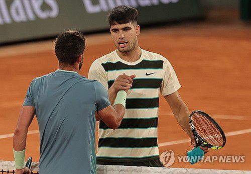 (서울=연합뉴스) 김동찬 기자 = '디펜딩 챔피언' 카를로스 알카라스(2위·스페인)가 프랑스오픈 테니스 대회(총상금 5천635만2천유로·약 876억7천만원) 남자 단식 16강에 진출했다.