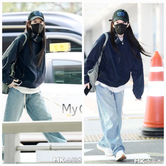 그녀가 선택한 공항패션은 전체적으로 톤 다운된 네이비 바람막이 재킷과 와이드 핏 라이트 데님 팬츠, 화이트 스니커즈로 구성됐다. 여기에 그레이 숄더백을 매치해 무심한 듯 편안한 무드를 연출했으며, 깔끔하게 풀어내린 생머리는 특유의 단정함과 자연미를 배가시켰다.