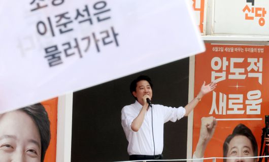 30일 오후 서울 동작구 중앙대학교 후문에서 대학생들이 유세를 펼치는 이준석 개혁신당 대선후보를 향해 혐오 발언 규탄 피켓을 들어 보이고 있다. 뉴시스 |