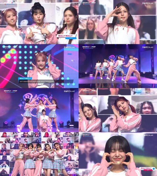 이날 멤버들은 베이비 핑크 컬러의 스웨트 셔츠, 후디에 같은 컬러의 트랙 팬츠와 민트빛 체크무늬 셔츠를 조합한 사랑스러운 스쿨룩으로 무대에 올라 등장부터 글로벌 팬들의 이목을 집중시켰다.
