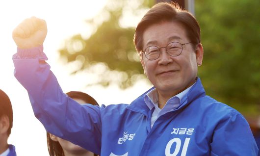 이재명 더불어민주당 대선후보가 30일 오후 충북 충주시 충주체육관 시계탑광장에서 열린 유세에서 시민들에게 인사하고 있다. 충주=뉴시스 |