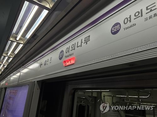 서울 지하철 5호선 여의나루역[연합뉴스 자료사진] ▶제보는 카카오톡 okjebo▶연합뉴스 앱 지금 바로 다운받기~▶네이버 연합뉴스 채널 구독하기<저작권자(c) 연합뉴스, 무단 전재-재배포, AI 학습 및 활용 금지>