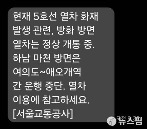 서울교통공사는 31일 오전 9시 32분께 안전 안내 문자를 통해 "5호선 열차 화재 발생 관련, 방화방면 열차는 정상 개통 중이다. 하남 마천 방면은 여의도~애오개역간 운행은 중단됐다. 열차 이용에 참고하라"고 공지했다. [사진=서울교통공사 안전 안내 문자 캡처] |