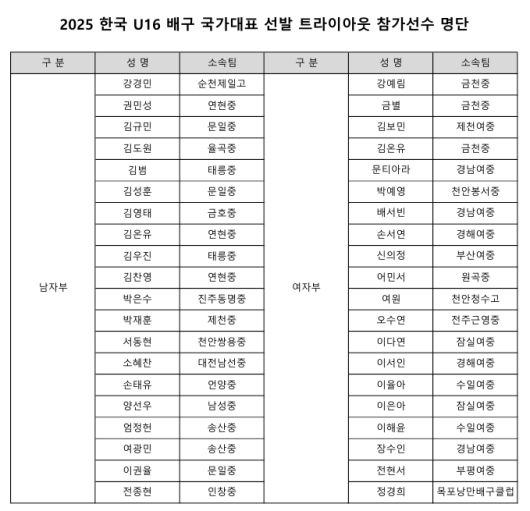 2025 한국 U16 배구 국가대표 선발 트라이아웃 참가 선수 명단. 대한배구협회 제공 |