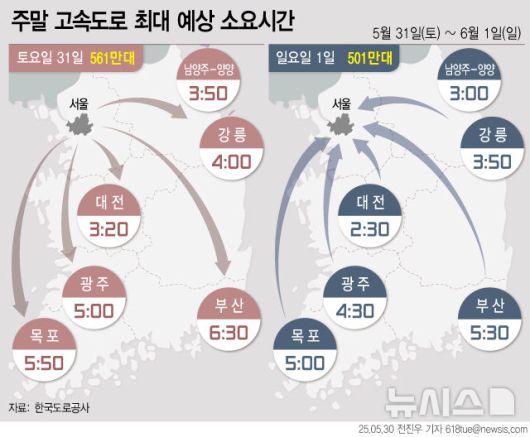 낮 12시 요금소 기준 주요 도시 간 예상 소요 시간은 하행선 ▲서울~부산 5시간50분 ▲서울~대구 4시간50분 ▲서울~광주 4시간40분 ▲서울~대전 2시간50분 ▲서울~강릉 4시간 ▲서울~울산 5시간20분 ▲서울~목포 5시간이다.