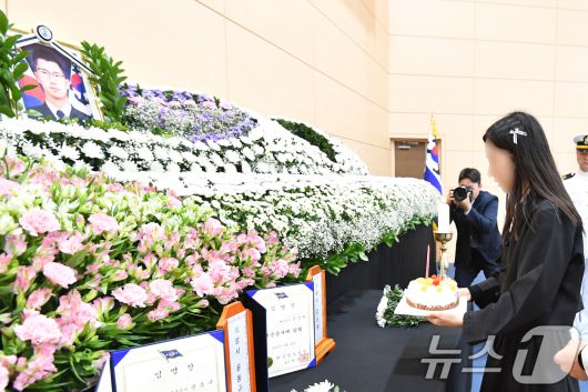 31일 오전 경북 포항시 남구 해군항공사령부 내 금익관에 마련된 해상초계기 추락 순직자 합동분향소에서 고 강신원 상사의 여동생이 오빠 영정에 생일 케이크를 올리고 있다. 고 강 상사는 오늘이 음력 생일이다. 2025.5.31/뉴스1 ⓒ News1 최창호 기자 |