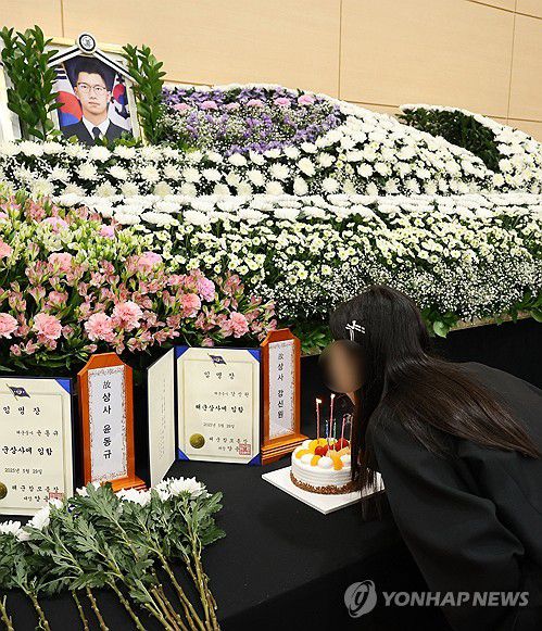 (포항=연합뉴스) 황수빈 기자 = 31일 경북 포항시 남구 해군 항공사령부 체육관에 마련된 합동분향소에서 고 강신원(25) 상사의 유족이 강 상사의 음력 생일을 맞아 생일 케이크 촛불을 불고 있다. 2025.5.31