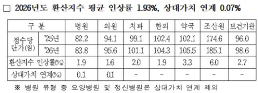 내년 요양기관 유형별 환산지수 인상률은 병원 2.0%, 의원 1.7%, 치과 2.0%, 한의 1.9%, 약국 3.3%, 조산원 6.0%, 보건기관 2.7% 등으로 결정됐다. 이 가운데 병원과 의원에는 상대가치 몫으로 0.1%씩을 더 올렸다.