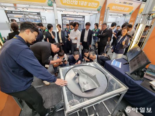 29일 경북 경산시 경일대 종합체육관에서 열린 ‘제2회 실리(SILI) 경진대회’에서 일본 자동차 업계 관계자들이 아진산업 자동화기술팀이 개발한 발판 이용 회전형 작업 테이블을 자세히 살펴보는 모습. 경산=김도형 기자 dodo@donga.com |