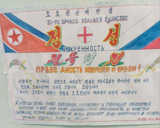 한글 편지에는 ‘혈육의 정’이라는 커다란 글씨와 함께 “사랑하는 친어머니 심정으로 아낌없는 정성을 기울이고 있는 부서 안의 전체 의사, 간호원, 료리사(요리사)들에게 인사를 드린다. 고맙다”며 “우리는 그대들이 바치는 진정을 조로(북러) 친선의 역사 속에 영원히 새길 것”이라는 내용이 적혔다. 맨 끝엔 ‘92려단 4대대 리정○’라는 소속과 이름도 덧붙였다.