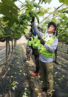 이날 일손돕기에는 이영규 IT전략본부장을 비롯한 임직원 40여 명이 참여, 포도 곁순따기와 지네발 제거 작업 등을 실시하며 구슬땀을 흘렸다.