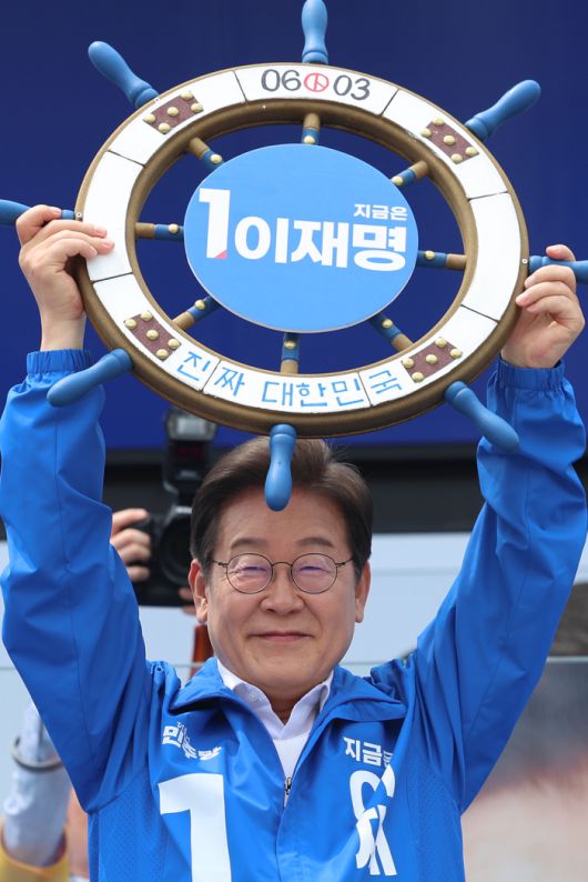 이재명 더불어민주당 대선 후보가 선거를 사흘 앞둔 마지막 주말인 31일 경기 평택시 배다리생태공원에서 열린 평택·오산·안성시 유세에서 조타기를 들어보이고 있다. <연합뉴스> |