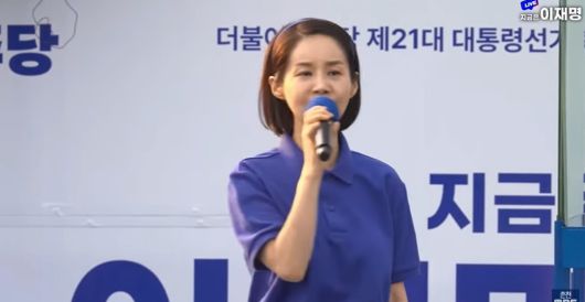 김가연은 파란 셔츠를 착용한 채 마이크를 잡고 이재명 공개 지지를 선언했다.