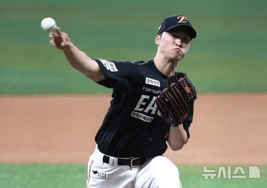 [서울=뉴시스] 정병혁 기자 = 9일 서울 구로구 고척스카이돔에서 열린 2025 KBO리그 한화 이글스 대 키움 히어로즈의 경기, 한화 선발 엄상백이 역투하고 있다. 2025.05.09. jhope@newsis.com |