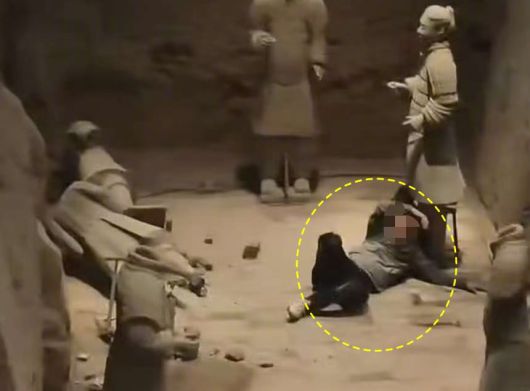 중국 소셜미디어(SNS)에는 병마용 2개가 쓰러져 있는 가운데 한 남성이 오른손을 머리에 올린 채 누워 있는 모습의 사진이 올라왔다.