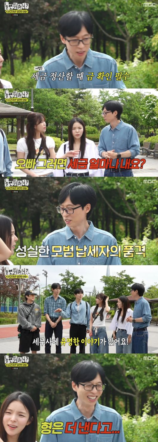주우재는 "재석이 형은 대상으로만 금 300톤 받아서 그렇다"고 답했다 미주는 유재석에게 "오빠는 세금을 얼마 정도 내시냐"고 물었다. 유재석은 "세금 많이 낸다"며 자신있게 대답했다. 이이경은 "세무사에서 유명한 얘기가 있다. 실제로 들었다. 형은 불안하시면 더 낸다고 들었다"고 밝혔다.