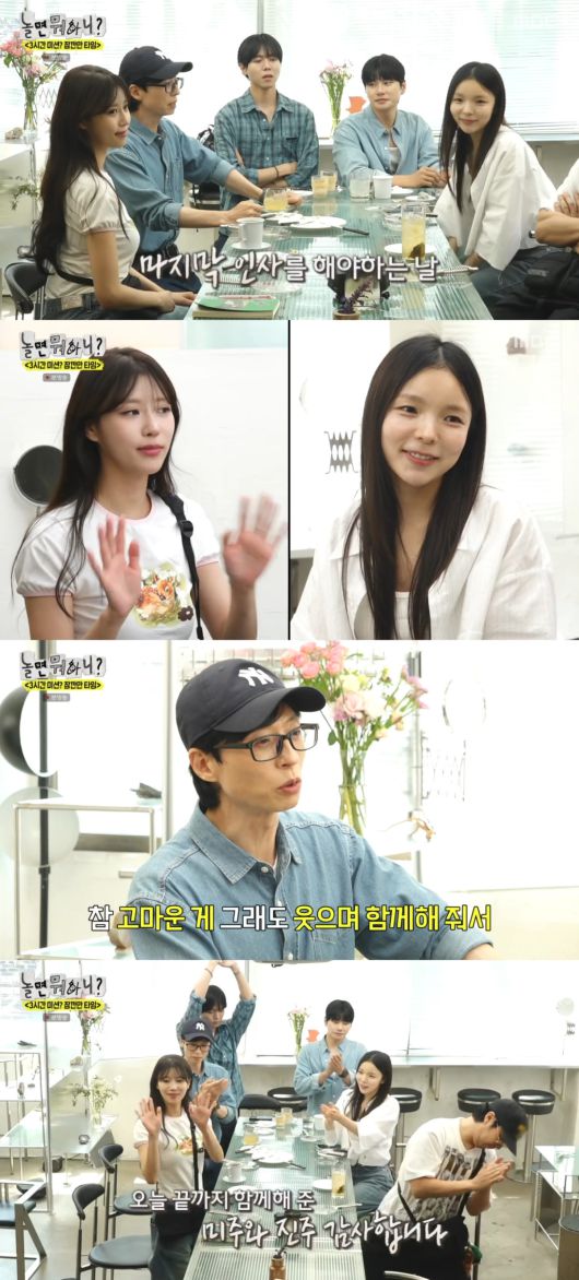 이어 유재석은 “오늘 하루 우리가 웃으며 녹화했지만 오랫동안 함께했던 미주와 진주가 마지막 인사를 하는 날”이라며 “저희는 걱정 많이 했다. 저희나 제작진이나 마음이 무겁다. 두 사람이 티도 안 내고 웃으며 녹화해서 마음이 더 그렇다”라고 착잡함을 드러냈다.