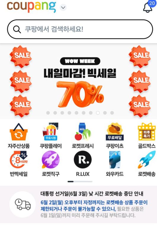 쿠팡은 공지에서 "(대선 전날인) 6월2일 오후부터 자정까지는 로켓배송 상품 주문이 제한되거나 주문이 불가능할 수 있다"고 밝혔다.