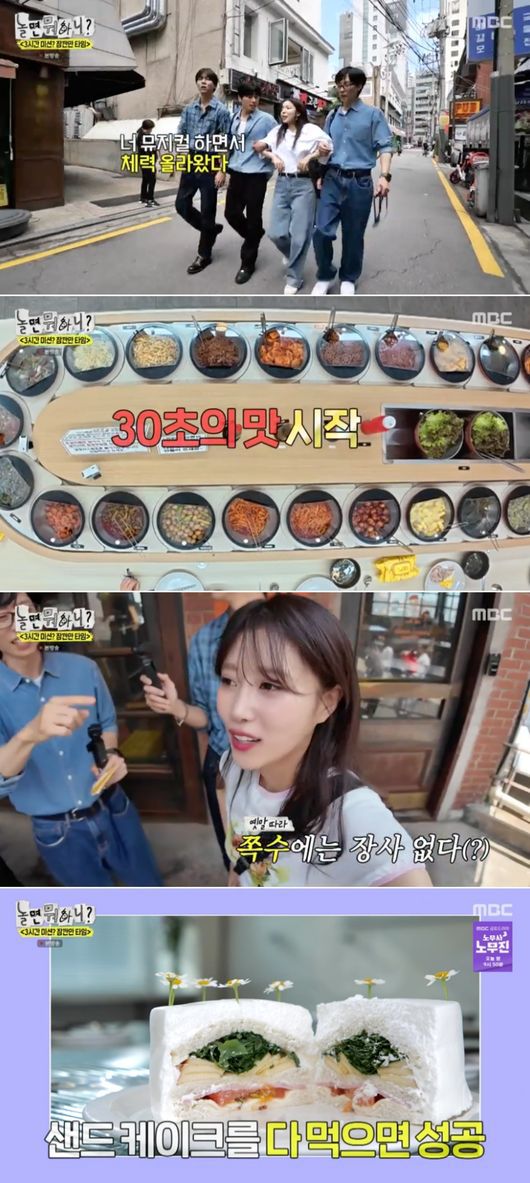 막상 식당에 도착해서도 쉽지 않았다. 첫 식당에서는 '30초의 맛' 미션이 있었다. 단 30초 만에 빠르게 회전하는 뷔페 식당들의 음식들을 담아야 했다. 유재석은 제육을 뜨기 위해 기계를 향해 '스톱'을 외치기까지 했다. 가까스로 접시를 채운 멤버들은 줄줄이 이어질 식당들에 소식에 만족했다. 또한 주우재는 "광재 형 알려줘야겠다"라며 '놀뭐'의 가족 같은 게스트들을 언급하기도 했다.