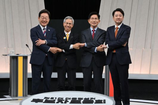 왼쪽부터 이재명 더불어민주당 후보, 권영국 민주노동당 후보, 김문수 국민의힘 후보, 이준석 개혁신당 후보가 지난 27일 서울 마포구 상암동 MBC 스튜디오에서 진행된 정치 분야 TV토론회에 앞서 포즈를 취하고 있다. [사진 출처 = 국회사진기자단] |