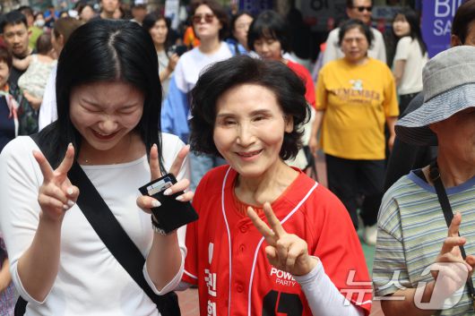 (서울=뉴스1) = 김문수 국민의힘 대통령 후보 부인 설난영 여사가 31일 서울 마포구 망원시장을 찾아 시민들과 기념사진을 찍고 있다. (국민의힘 제공. 재판매 및 DB 금지) 2025.5.31/뉴스1kkorazi@news1.krCopyright ⓒ 뉴스1. All rights reserved. 무단 전재 및 재배포, AI학습 이용 금지.