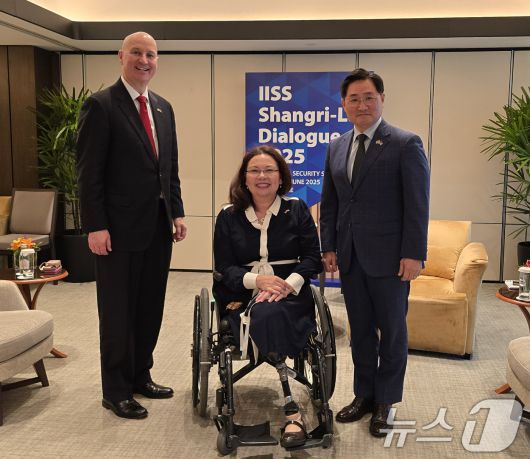 조창래 국방부 국방정책실장이 31일 싱가포르에서 열린 제22차 아시아안보회의 계기 미 상원의원 면담에서 참석자들과 기념사진을 찍고 있다. 왼쪽부터 피트 리케츠 상원의원, 태미 덕워스 상원의원, 조 실장. (국방부 제공. 재판매 및 DB 금지) 2025.5.31/뉴스1 |