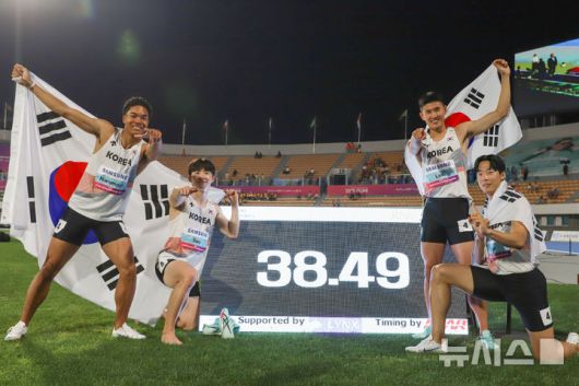 [서울=뉴시스]안경남 기자 = 한국 육상 남자 400m 계주 대표팀이 한국 기록과 대회 기록을 동시에 경신하며 2025 아시아육상선수권대회 금메달을 목에 걸었다.