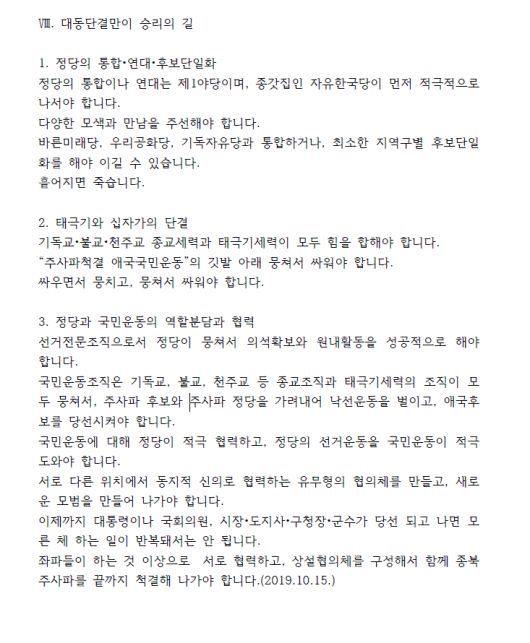 “<자유대한민국수호 비상국민회의>는 국회를 기반으로 자유한국당, 우리공화당, 바른미래당 국회의원 모임을 구성하고, 기독교세력, 태극기세력 등 반문재인·반주사파 세력과 빅텐트를 치고, 문재인 주사파 집권세력과 맞서 싸워 이겨서 자유민주주의 대한민국을 지켜야 합니다."