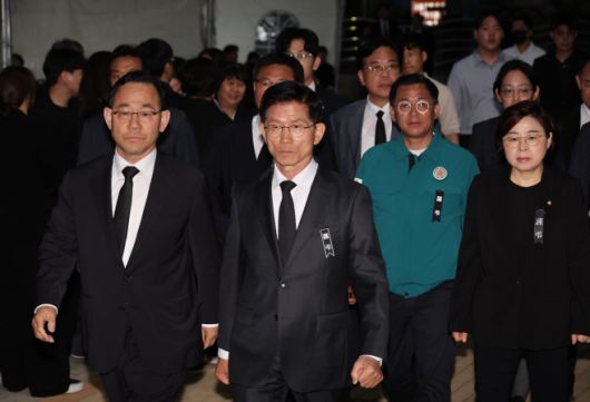 김문수 국민의힘 대선 후보가 31일 경북 포항시 남구 해군 항공사령부 체육관에 마련된 '해군 P-3CK 917호기 순직자 합동분향소'로 향하고 있다. /연합 |