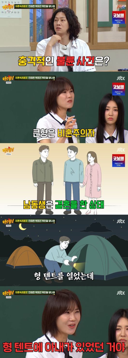양나래는 "형제가 있었다. 큰형은 비혼주의자였다. 남동생은 결혼을 했다. 가정을 잘 꾸렸다. 형이 혼자 있으니 안쓰러워서 부부가 캠핑 등 놀러 갈 때 같이 동행했다. 근데 아무리 형제자매여도 부부가 따로 텐트를 쓰다. 남편이 자다가 와이프가 없었다. 걱정돼서 찾으러 갔는데, 없어서 형에게 도움을 요청하러 형 텐트에 갔다. 거기에 아내가 있었다. 비일비재는 아니지만 없는 일은 아니다"며 충격적인 일화를 밝혔다.