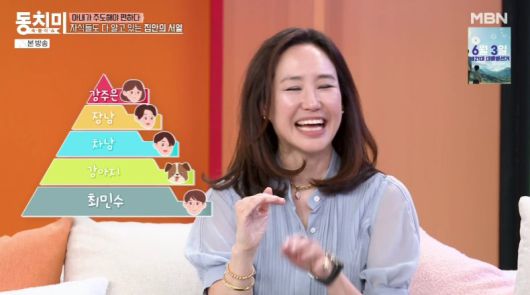 강주은은 "(서열 피라미드에서) 제가 제일 꼭대기에 있다. 그 다음에 큰 아들, 둘째 아들, 강아지, 최민수 순"이라고 밝혀 눈길을 끌었다.