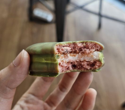 평소 오예스, 몽쉘, 초코파이 중 ‘최애’가 초코파이다. 초코파이 수박맛은 일단 뜯는 순간 비쥬얼이 너무 인기 애니메이션 영화 ‘슈렉’의 주인공과 같았다. 한 입 베어 물고 나니 안쪽 비쥬얼도 비슷했다. 수박을 그대로 형상화한다고 갖은 노력을 한 게 느껴졌지만 썩 맛있어 보이지는 않았다. 안타까운 건 수박이 직관적으로 떠오르지도 않았다는 점이다.
