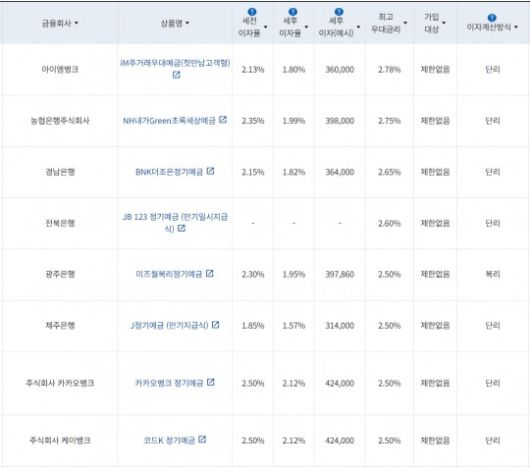 1일 금융감독원 금융상품통합비교공시에 따르면 은행 24개월 정기예금 상품 중 최고 우대금리를 제공하는 상품은 iM뱅크의 ‘iM주거래우대예금(첫만남고객형)’으로, 최고 2.78%의 금리를 제공한다. 우대 조건은 ▲‘목돈굴리기예금’ 최초 가입 시 0.20%p ▲상품 가입 전 최근 1개월 이내 신용(체크)카드 신규 발급 시 0.20%p ▲상품 가입 전 최근 1개월 이내 인터넷·폰·모바일뱅킹으로 가입 시 0.20%p 등이다. 계좌당 가입 최저 한도는 100만원이다.