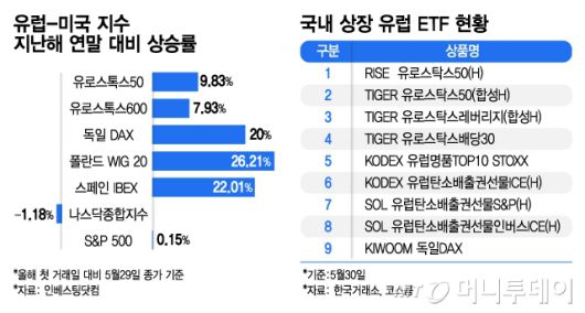 올해 유럽 증시가 이례적으로 높은 성과를 내며 미국 증시 수익률을 앞질렀다. 그러나 국내 증시에 상장된 유럽 관련 ETF(상장지수펀드)는 9개에 불과하다. 국내 투자자들의 해외 '분산 투자' 수단이 한정적이라는 지적이 제기된다.